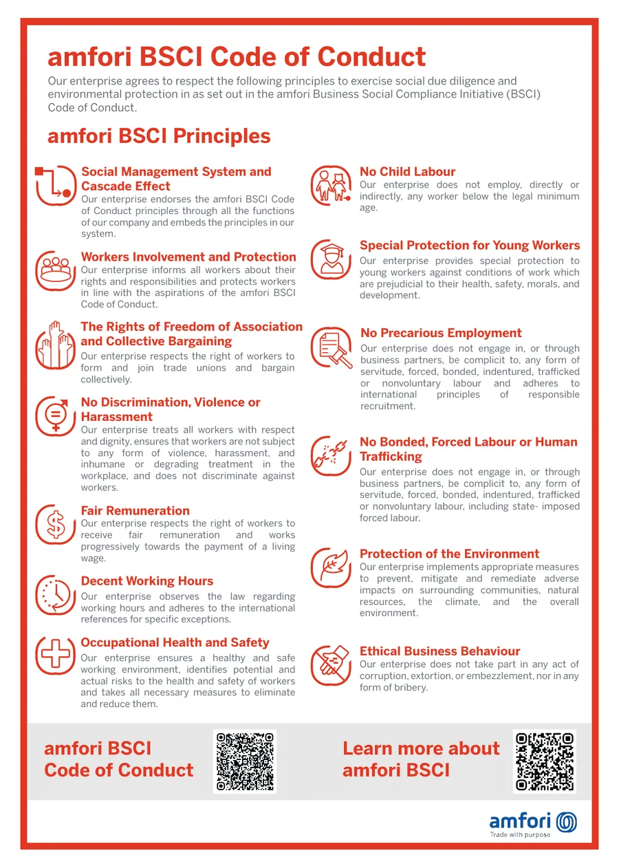 Business partners that sign the amforiBSCI CoC commit to exercise human rights due diligence and environmental protection in their supply chains and business activities.